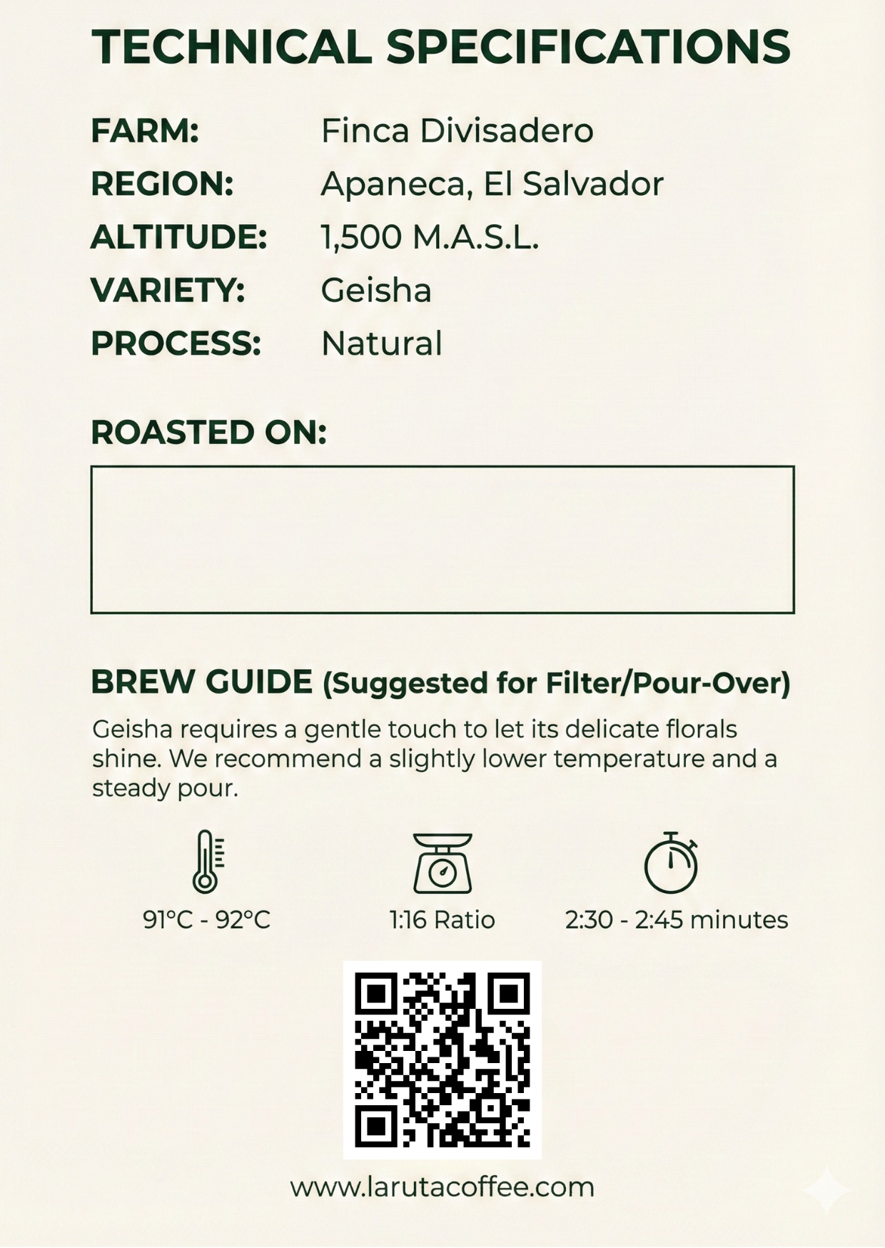 Grown at the prestigious Finca Divisadero in the Apaneca highlands, this Geisha variety is the crown jewel of our collection. It represents the ultimate expression of terroir, cultivated with meticulous precision to unlock a flavour profile that is incredibly rare and sought-after.