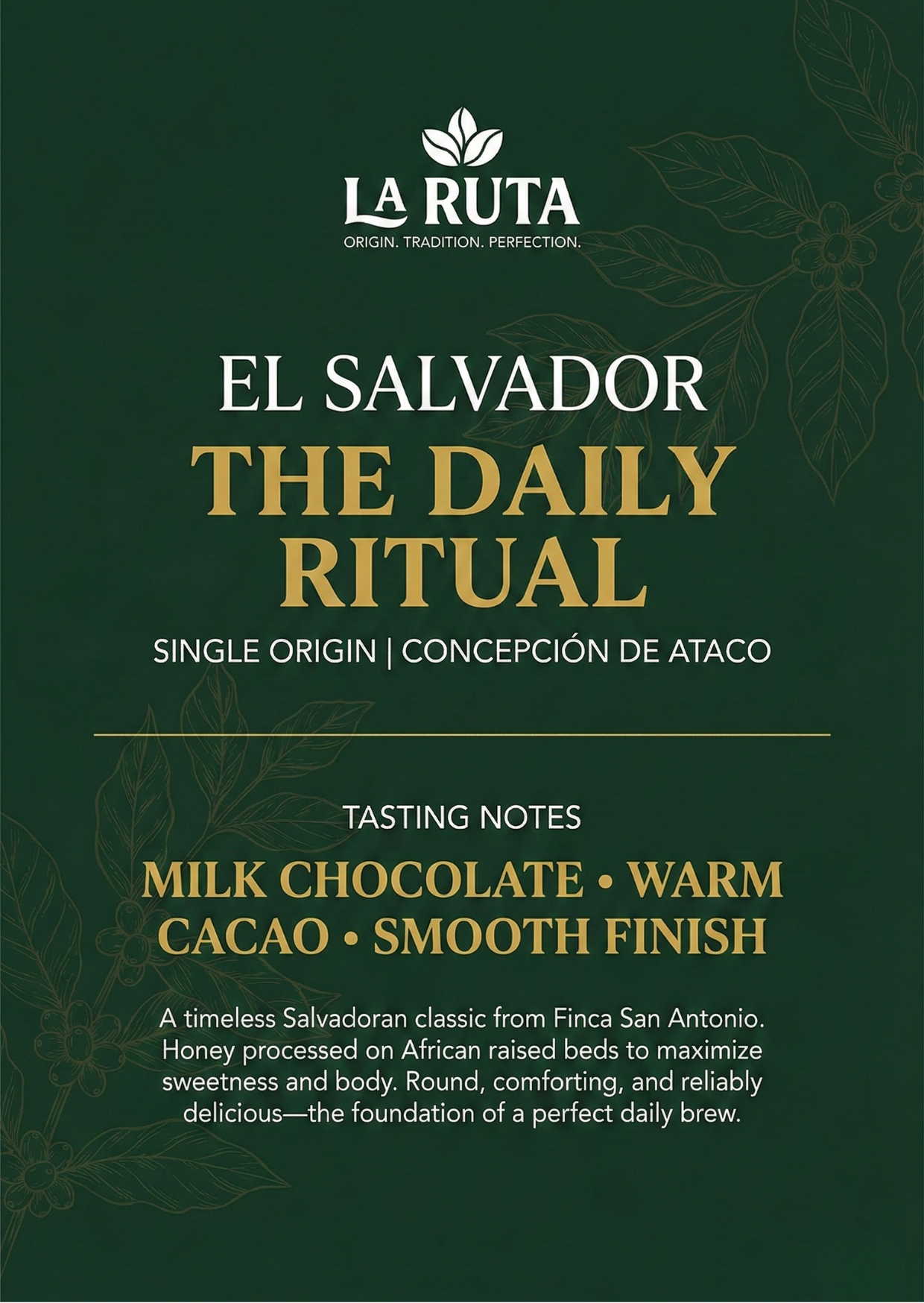 Sourced from the volcanic soils of Finca San Antonio in Concepción de Ataco, this Red Bourbon is a timeless Salvadoran classic. It is processed using the "Honey" method on African raised beds, which leaves a layer of natural mucilage on the bean during drying.